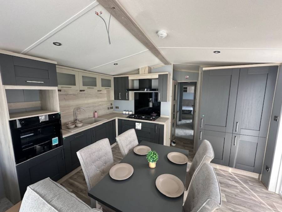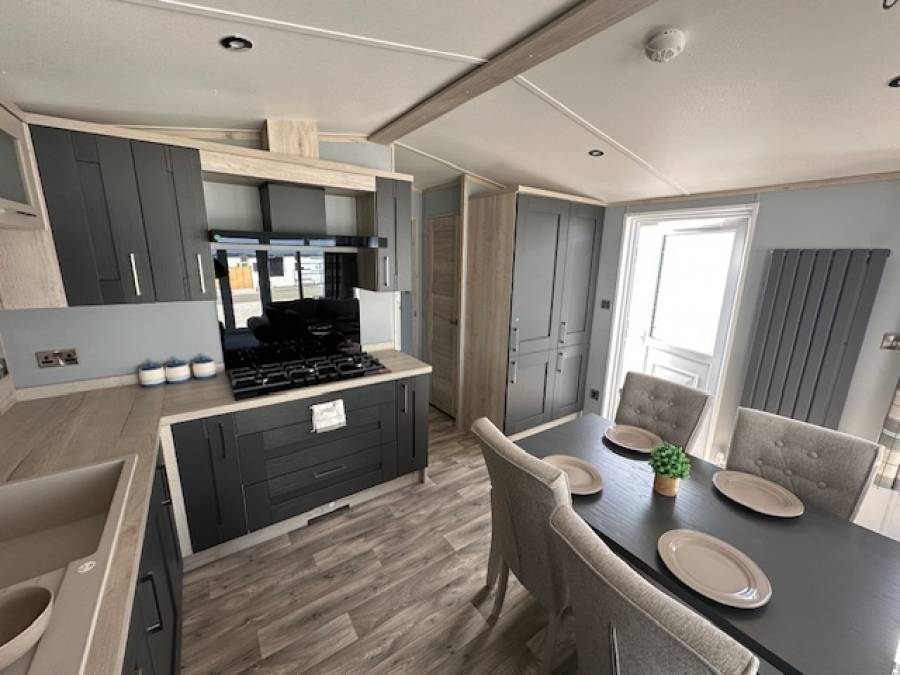 Meal times are a breeze in the Whinfell's well equipped kitchen, featuring a gas hob with overhead extractor, fan oven and microwave all surrounded by light oak timber accents and warm grey fronted doors. Guests are kept comfortable with button backed, cushioned dining chairs.