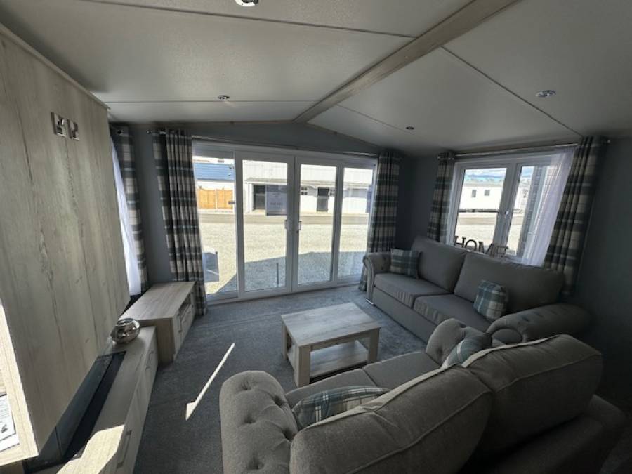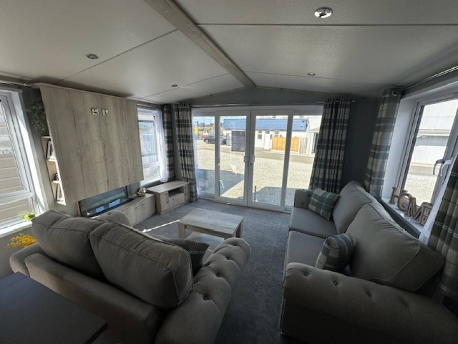 Patio doors open into the spacious open plan lounge. Deep into the comfortable sofas, beside the flame effect fire, here you will find relaxation.